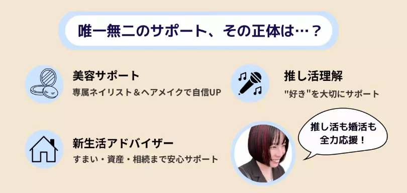私は推し活を楽しみながら結婚し、今は二人の子どもの母として、家族との時間も推し活も自分の時間も全部楽しんでいます。結婚は制限ではなく、人生をより豊かにするスタートだと感じています。婚活中は不安や迷いもあるかもしれませんが、一緒に笑いながら進めば大丈夫。私は世話好きでおしゃべり好き、感情豊かなので、喜びは一緒に分かち合い、悩みは一緒に乗り越える仲人です。あなたらしさを大切に、楽しく真剣に成婚を目指せるよう全力でサポートします!
