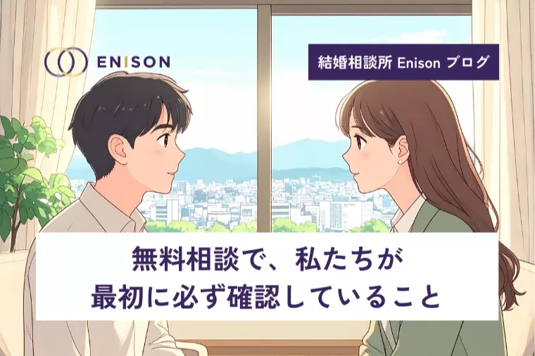 京都市・中京区の結婚相談所Enison(エニゾン)、栗山です。無料相談に来られる方には、少し緊張した表情で、こうおっしゃる方がいらっしゃいます。 「何から話せばいいのか分からなくて」 「今日、入会するか決めないといけませんか?」そんな言葉を聞くたびに、私たちはまず、あることを大切にします。年齢や年収、希望条件。もちろん、婚活において大切な要素です。ただ、Enisonの無料相談では、最初に条件の話から入ることはほとんどありません。なぜなら、条件の前に確認しておきたいことがあるからです。無料相談で私たちが最初に確認していることは、 ・これまで、どんな婚活をしてきたか ・どこで迷いやすくなったのか ・何が分からなくなって、立ち止まったのかといった今の状況です。「うまくいかなかった理由」を指摘するためではありません。これ以上、一人で抱え込まなくていいポイントを見つけるためです。無料相談というと、 ・アドバイスをもらう場 ・正しい進め方を教えてもらう場と思われがちですが、Enisonでは、その場で答えを出すことを目的にしていません。なぜなら、 ・気になっていることがまだある ・気持ちが整理できていない状態で結論を出しても、後から違和感が残ることが多いからです。無料相談では、こんな点を静かに見ています。 ・話している時、どこで言葉に詰まるか ・どんな話題で迷いが出るか ・無理に前向きになろうとしていないかこれらは、婚活を進めるうえでとても大事なサインです。Enisonでは、無料相談の場で入会をおすすめしないケースもあります。 ・今は少し休んだ方がいいと感じる時 ・活動する前に整理が必要な時その場合は、正直にお伝えします。婚活は、「始めるタイミング」よりも「どう進めていくか」の方が大切だからです。無料相談は、 ・決断する場 ・覚悟を決める場ではなく、今の状況を言葉にして、一度、整理するための時間と考えています。無料相談では、無理に話をまとめる必要はありません。うまく説明できなくても、迷いがはっきりしていなくても大丈夫です。Enisonでは、納得して判断できる状態をつくることを大切にしています。「少し話してみたい」その気持ちからで構いません。今の状況を整理するところから、一緒に始めてみませんか。