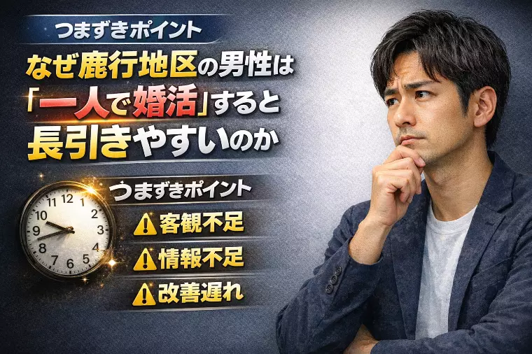 はじめに|真面目な人ほど、婚活が長期化しやすい理由鹿行地区で婚活をしている30代後半男性と話していると、こんな共通点がよく見えてきます。手を抜いているわけではないそれなりに考えて行動している周囲に迷惑をかけず、自分で何とかしようとしているにもかかわらず、なぜか婚活だけが長引いてしまう。実はこれ、珍しいことではありません。むしろ真面目で自立している男性ほど、はまりやすい構造があります。この記事では、なぜ鹿行地区では「一人で婚活を続けるほど遠回りになりやすいのか」その理由を、感情論ではなく現実ベースで整理していきます。鹿行地区の婚活は「自己流」が通用しにくいまず前提として、鹿行地区は婚活において決して条件が良いエリアとは言えません。出会いの母数が少ない男性比率が高い新しい出会いが循環しにくいこの環境では、試行錯誤の回数=消耗の量になりやすいのが現実です。都市部のように「数を打てば、そのうち当たる」という戦い方は、成立しにくいのです。一人婚活が長引く理由①|ズレに気づけない一人で婚活をしていると、最大の問題はこれです。「何がズレているのか分からない」条件設定は現実的かプロフィールはどう見えているか初対面の印象はどう受け取られているかこれらは、自分ではほぼ判断できません。特に男性は「普通にしていれば問題ないはず」と考えやすく、ズレを放置したまま時間が過ぎていきます。一人婚活が長引く理由②|判断基準が感覚的になる何となく合いそう何となく違う気がするもう少し様子を見よう一人で婚活をしていると、判断基準がどうしても感覚頼りになります。しかし婚活は、感情が絡むぶん、判断を誤りやすい分野です。結果として可能性のある相手を逃す同じタイプで何度も失敗するということが起きやすくなります。一人婚活が長引く理由③|やめ時が分からないアプリ婚活で特に多いのが、この状態です。「もう少し頑張れば何とかなる気がする」「ここまでやったんだから、今さらやめにくい」こうして合っていないやり方をズルズル続けてしまう。第三者がいれば「今は切り替え時ですね」と整理できますが、一人では難しい判断です。「頼る=弱い」ではないここで誤解してほしくないのは、誰かに相談する=能力が低い、という話ではないということです。仕事でも上司に相談する専門家に意見を聞くこうした行動はむしろ合理的な判断です。婚活だけ「全部一人でやらなければいけない」と考える必要はありません。結婚相談所が機能する理由は「管理」ではなく「整理」結婚相談所というと、管理される縛られる指示されるそんなイメージを持つ男性もいます。しかし実際に機能している部分は、あなたの婚活を整理する役割です。どこがズレているかどこは問題ないか何を変えるべきかこれを第三者視点で整理できるかどうかが、婚活のスピードを大きく左右します。鹿行地区では「遠回りしないこと」が最大の戦略鹿行地区の婚活では、選択肢が少ない失敗のリカバリーが効きにくいだからこそ遠回りしない判断そのものが武器になります。早く動いた人が勝つ、というより早く整理した人が結果を出しやすい。これは現場で見ていて、はっきり言えることです。行動喚起|一人で抱え込まなくていいもし今、何が正解か分からなくなっている同じところで足踏みしている気がするでも結婚は諦めたくないそう感じているなら、一度、状況を整理する時間を作ってみてください。結婚相談所の無料相談は、入会を決める場ではありません。「一人で続けるべきかどうか」を判断する場です。鹿行地区で、30代後半男性の婚活を見てきた立場から、現実的な選択肢を率直にお伝えします。遠回りを続ける前に、まずは一度、立ち止まって整理してみてください。