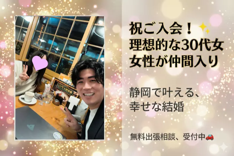 こんにちは!静岡市を拠点に、静岡県全域の婚活をプロデュースする結婚相談所静岡婚活コンシェルジュです。2月に入り、少しずつ春の足音が聞こえてきましたね。当相談所では、まさに「春のような温かい雰囲気」をお持ちの素敵な女性が活動をスタートされました!先日、新たに30代前半の女性会員様がご入会されました!第一印象は、パッと目を引く華やかな美人さん✨ですが、お話ししてみると、とても「穏やか」で「お優しい」雰囲気に、私自身もすっかり癒やされてしまいました😌一緒にいるだけで心が安らぐ、柔らかい空気感をお持ちの方です。「この方と結婚された男性は、毎日家に帰るのが楽しみになるだろうな…」カウンセリング中、そんな温かい家庭の風景が目に浮かびました。性格もとても素直で、真剣にパートナーを探されています。男性の皆様、早めのチェックをおすすめしますよ!✨「いいなと思っても、なかなか踏み出せない…」そんなあなたへ。2月は日数が少ないですが、婚活にとっては「春の準備」をする大切な時期です。今(2月上旬)に活動を始めれば…✅2月中に:お見合い&仮交際スタート✅3月に:デートを重ねて仲を深める✅4月には:満開の桜の下で、お相手と手をつないでお花見デート🌸この最高のシナリオを実現するには、今動き出すのがベストタイミングなんです。「相談所に行きたいけど、忙しくて時間が作れない」そんなあなたの背中を押すために、私たちは「フットワークの軽さ」で応援します!⭐️2026年婚活スタート応援特典⭐️✅①静岡県内【無料】出張相談🥰(静岡市、焼津、藤枝、富士、沼津…あなたの街の近くのカフェまで伺います!)✅②あなただけの《婚活ガイドブック》プレゼント📘✅③あなたの恋愛傾向がわかる《相性診断》♥✅④実際のシステムを使った「お相手探し体験」✨わざわざ遠出しなくても大丈夫です。お仕事帰りや休日のちょっとした隙間時間に、私があなたの元へ伺います。(もちろんオンラインもOKです!)「いきなり入会は怖い」という方は、特典の④「お相手探し体験」だけでも大歓迎です!実際のシステム画面を見て、「静岡にこんないい人がいるんだ!」と実感するだけで、世界が変わりますよ。無理な勧誘は一切いたしません。世界一寄り添ったサポートで、あなたの2026年を応援します。【お問い合わせ方法】こちらからお問合せください▼https://docs.google.com/forms/d/e/1FAIpQLSfvFvCz_XQBX8EJbOINH3mJW3qdtkB75H2sF06k_GSMYPOu6w/viewform?usp=pp_url素敵な会員様とのご縁も、まずはこの「相談」から始まります。ご連絡、心よりお待ちしております!静岡婚活コンシェルジュでは、成婚までの最短ステップをデザインします。ファッションやボディメイクなど、外見改善のコンサルも可能✨妥協しない婚活のご提案をいたします。✅専属カウンセラーが一人ひとりに合わせてサポート✅リーズナブルな料金設定で若い方でも安心✅約5,000社の中から上位約10%に選出された実績あり(IBJAWARD受賞)🌐ホームページ▼https://shizuoka-concierge.jp/📱LINE静岡婚活コンシェルジュ公式LINE▼https://lin.ee/MpNHVyG💌お問い合わせ・ご相談LINEの友だち登録後、メッセージをお送りください。24時間受付中です♪