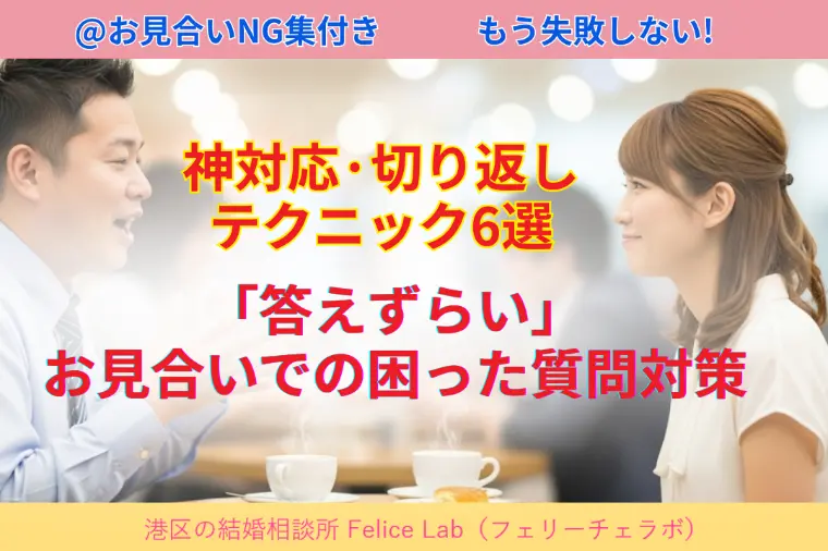 皆様、こんにちは。港区の結婚相談所フェリーチェラボ、カウンセラーの笹﨑です。お見合いやデートの席で、お相手から「えっ、それはちょっと答えづらいな…」という質問を投げかけられ、ヒヤッとした経験はありませんか?実は、良かれと思って何気なく発した言葉が、お相手を不快にさせたり、あなたの印象を悪くしてしまったりすることがあります。お見合いには、お相手の活動状況やプライバシーに深く踏み込まないといった、守るべき大切なマナーが存在します。今回は、成婚実績の高いカウンセラーの視点から、1.お見合い!避けるべきNG話題2.困った質問をされた時の「スマートな対処法」3.素敵な出会いにするための心得をご紹介します。これを読めば、どんな場面でも焦らず、笑顔で楽しい会話を続けられるようになりますよ。最後まで読んでくださった方には🎁プレゼントも用意しています!!①お見合い会話マナー集②お見合い~仮交際見極めチェックリスト③婚活タイプAI診断まず、お見合いには「言ってはいけない」ルールとマナーがあります。以下の内容は、お相手を不快にさせたり、あなたの印象を大きく下げたりする可能性があるため、自分からは触れないのが鉄則です。「これまで何人と会いましたか?」「いつ相談所に入ったのですか?」「この後も他の人とお見合いですか?」「どこの相談所ですか?」といった質問はマナー違反です。お見合いや仮交際(プレ交際)中は、お互いに複数の方とお見合いをし、並行してデートしても良い時期です。お互い様なので、活動については触れないのがマナーです。お見合いの際には、踏み込みすぎた個人情報についての質問は避けるべきです。具体的には、勤務先の詳細や最寄り駅、住まいの場所、フルネーム、連絡先やLINEの交換を無理に迫ることはNGです。例えば、以下のようなエピソードがあります。お見合いの場で、AさんがBさんに「どこの会社に勤めているの?」「住んでいる場所はどこ?」といった質問を続けてしました。Bさんは最初は軽く答えましたが、次第に不快感を覚え、「それはちょっとプライベートすぎるかも」と感じるようになりました。このように、相手が気を使うような質問をすることで、せっかくの良い雰囲気が壊れてしまうことがあります。プライバシーの尊重:相手のプライバシーを尊重し、無理に個人情報を引き出そうとしないことが大切です。お互いに信頼関係を築くためには、まずは軽い話題から始め、徐々に関係を深めていくことが望ましいです。相手に安心感を与えるためにも、個人情報に関する質問は控え、楽しい会話を心がけましょう。「なぜ今まで結婚しなかったのですか?」「どうして前のパートナーと別れたのですか?」「なぜ離婚したのですか?」「なんで入会したのですか?」など、お見合いで踏み込み過ぎ、相手を詮索するのはやめましょう。結婚する上で知っておいた方が良い事柄もありますが、初対面のお見合いで聞くべきことなのかを考えましょう。事前にプロフィールを読み、気になったことがあった際には、失態する前に質問しても良いかなどカウンセラーに相談しましょう。お見合いの際には、お金や条件に関する話題について慎重になるべきです。唐突に貯金額や年収、資産、将来の同居予定などを問い詰めることは、「下品」「自分本位でガツガツした印象」を与える可能性があります。例えば、以下のようなエピソードがあります。お見合いの場で、CさんがDさんに「あなたの資産は何かありますか?」「貯金はどのくらいありますか?」といった質問をいきなりしました。Dさんは驚き、「そんなことを初対面で聞かれるとは思わなかった」と感じ、会話がぎこちなくなってしまいました。このように、金銭的な話題を初めて会う場で唐突に持ち出すことで、相手に不快感を与え、良好な関係を築くチャンスを逃してしまうことがあります。信頼関係の構築:お金や条件については、相手との信頼関係が築かれてから話すべきです。初対面では、まずは趣味や価値観について話し合うことが大切です。お互いにリラックスできる雰囲気を作ることで、自然な会話が生まれ、より良い関係を築くことができます。このように、お金や条件に関する話題は慎重に扱い、相手に安心感を与えることを心がけましょう。婚活のお見合いにおいて、容姿や体型に関する言及、ボディタッチは厳禁です。具体的には、以下のような発言や行動が該当します。「スタイルがいいですね」「写真と違いますね。」「セクシーですね。」といった、相手の見た目に対する批判やアドバイス。「胸(体)が大きいですね。」「ダイエットとかしないんですか?」「もう少し痩せた方がいいかも。」といった、相手の体型を直接的に触れる発言。相手に同意を求めずに、相手の肩を叩いたり、腕や体に触れたりする行為やいきなり手をつなごうとするのは禁止です。特に、お見合いの場では相手が不快に感じる可能性のあるボディー