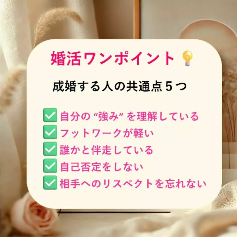 なぜ、「運命の人」に出会えないのか?と悩んでいませんか。結婚したいと強く願っているのに、なかなか理想の相手に巡り会えない。このページを開いたあなたは、真剣にそう感じているのではないでしょうか。婚活市場には多くの人がいますが、ただ活動しているだけでは、時間だけが過ぎてしまいます。結婚とは、偶然の「運命」に任せるものではなく、明確な意図と戦略、そして何よりも正しい心の持ちようによって、自ら掴み取るものです。成功する方々には共通のパターンが存在します。結婚を現実にするための具体的な5つのステップ、具体的な秘訣、そして成婚を引き寄せる心の持ちようを、余すことなくお伝えします。このロードマップを読み終える頃には、あなたの婚活への迷いは消え、明日から何をすべきかが明確になっているはずです。さあ、一緒に理想の結婚への扉を開きましょう。婚活の成否は、活動を始める前の「心の準備」と「目標設定」で決まります。・年収や外見だけでなく、「金銭感覚」「仕事観」「子育ての方針」「休日の過ごし方」など、結婚生活の土台となる価値観を深く掘り下げてください。・条件を増やしすぎると出会いの間口が狭まります。本当に重要な「3つの譲れない条件」に絞り込みましょう。・「どんな家庭を築きたいか」「どんなパートナーと、どんな毎日を送りたいか」を具体的にイメージします。抽象的な「結婚したい」ではなく、具体的な未来像が、行動のモチベーションとなります。プロフィールは、あなたを相手に知ってもらうための最初のアピールポイントです。ここで「会いたい」と思わせるかが重要です。・写真:プロによる撮影は必須です。男女ともに重視される清潔感と、結婚生活がイメージできるような親しみやすい笑顔を意識しましょう。・文章:趣味や仕事の内容だけでなく、「なぜ結婚したいのか」「結婚したらどんな家庭を築きたいか」という未来への前向きなビジョンを具体的に書きます。ネガティブな表現は避け、ポジティブな言葉であなたの人柄を伝えましょう。・男性が特に求めるのは「家庭的な居心地の良さ」と「見た目の清潔感・好み」です。穏やかさや、自分を受け入れてくれる包容力をアピールしましょう。・女性が特に求めるのは「経済的な安定」と「誠実さ、家事・育児への協力意識」です。堅実な仕事への姿勢や、結婚生活を共に築く意欲を伝えましょう。準備が整ったら、積極的に出会いの場へ足を運び、多くのチャンスを作り出します。・理想の条件を全て満たす完璧な人はいません。あなたが設定した「本当に譲れない条件」を7割クリアしていれば、まずはお見合いを申し込んでみましょう。会ってみなければ分からない魅力はたくさんあります。見た目では判断しない!これが大事です。カウンセラーからの推薦は、あなたの潜在的な魅力や、ご自身では気づかない相性を考慮したものです。たとえ条件が完璧でなくても、一度会ってみることで新たな発見があるかもしれません。お見合いが成立し、仮交際へ進んだら、相手との距離を縮め、結婚へと繋がる関係を築いていきます。・自分の話をするのは3割程度に抑え、相手が気持ちよく話せるように質問を重ねましょう。特に、「金銭感覚」「仕事観」「家族観」といった結婚後の重要テーマについて、深く質問し、価値観のすり合わせを行います。・相手の意見を尊重し、共感する姿勢が大切です。・仮交際中は、最低でも週に一度は会うか、こまめに連絡を取り、親密感と安心感を育みましょう。・男性は、女性に精神的な安定と包容力を感じてもらえるよう努めましょう。女性は、男性に家庭的な安心感と誠実な将来設計を伝えることで、関係は真剣交際へと進展します。真剣交際へと進んだら、感情だけでなく、「夫婦としての現実的な未来設計」に基づいて決断します。・「この人でいいのだろうか」という迷いの壁は、誰もが経験します。自己判断で活動を止めず、必ずカウンセラーに相談し、客観的な意見やアドバイスを受けましょう。・完璧な相手はいません。相手の「変えられない部分」は愛情を持って許容し、日々の小さなことに感謝を伝え合う習慣が、夫婦の絆の土台となります。・結婚後の住まい、家事・育児の分担、お金の管理など、具体的な生活設計について徹底的に話し合い、二人の未来像を共有して決断しましょう。一人ではないから、きっとたどり着ける未来があります結婚は、行動し、戦略を練り、心を整えた人に訪れる最高のギフトです。この5つのステップを実践し、今日から「未来の結婚生活を送る自分」として、どうか自信を持って行動を始めてください。婚活は、決して一人で頑張るものではありません。迷いや不安、壁にぶつかったとき、立ち止まってしまいそうなときこそ、私たちカウンセラーの出番です。あなたの悩みを真摯に受け止め、あなたらしいペースで、理想のパートナーと出会えるよう、温かく、そ