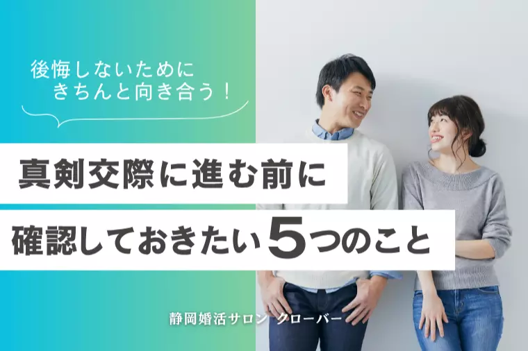 お見合い・仮交際を経て、次の大きなステップとなる「真剣交際」。ここに進むかどうかの判断は、婚活の分岐点ともいえる大切な場面です。ただ、気持ちが盛り上がっているときほど冷静な確認を忘れがち。結婚を意識した交際だからこそ、将来に関わるポイントをきちんとすり合わせておく必要があります。今回のコラムでは、仲人目線で【真剣交際に進む前に確認しておきたい5つのこと】を整理しました!結婚への温度感やお金の価値観、生活習慣や家族観など、具体的に意識すべきテーマをわかりやすく紹介しています。婚活中の方や、これから真剣交際を考えている方に役立つ内容です。婚活の参考にしていただけたら嬉しいです🍀▼続きはこちらから▼【真剣交際に進む前に確認しておきたい5つのこと】「そろそろ結婚したいな…」と思ったときがスタートの合図✨静岡婚活サロンクローバーは静岡県内を中心に全国対応!県内なら出張面談もOK(エリアによってはご相談ください)、遠方の方もオンラインで気軽にお話しできます!あなたの魅力をしっかり引き出しながら、「ここはもっと良くしたい!」という部分も的確にサポート。美容・エステ・パーソナルカラー・ジム・メイクなどのプロとも提携しているので、トータルで自信を持って婚活できますよ😊✅安心の実績・資格✅◆2025年上期IBJアワード受賞🏆◆JLCA認定婚活カウンセラースペシャリスト資格✨◆日本LGBTサポート協会加盟🌈◆色彩行動心理学アドバイザー📒IBJアワード受賞の実績に加え、専門資格や多様なサポート体制もあるからこそ、1年以内の成婚を目指す方に選ばれています。でも、堅苦しい感じはナシ!LINEやお電話で、ちょっとしたことでもすぐ相談できる“話しやすさ”が自慢です。まずは気軽に、無料相談でお話ししてみませんか?▼▼無料相談のお申し込みはコチラ▼▼ https://shizuoka-konkatsu-clover.com/consultation/