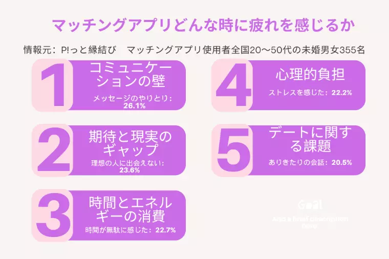 近年、マッチングアプリ利用者が増加する一方で、多くの男女が「疲れた」「自信を失った」と感じています。マッチングアプリでのやりとりや出会いが原因で、精神的に疲弊するケースが目立っています。IBJ正規加盟店『P!っと縁結び』が全国20~50代の未婚男女355名を対象に実施したアンケートでは、疲れの原因として次のポイントが多く挙げられました。1メッセージのやりとり26.1%2理想の人に出会えない23.6%3時間が無駄に感じる22.7%4ストレスや不快感約22%5実際に会った時のギャップ18.8%コミュニケーションの難しさや期待と現実のギャップ、時間や精神的負担から疲れを生んでいると考えられます。20代・30代:メッセージのやりとりやギャップに疲れを感じる方が多い。40代・50代:マッチングしないことややりとりの負担が特に大きい傾向。年代によって疲れの原因の違いも認められます。写真や自己紹介を魅力的に整え、理想に近い相手とマッチしやすくする。理想と現実のバランスをとり、過度な期待を控える。1日に利用する時間を決めるなど無理のないペースで活動する。通知オフや「いいね」基準の設定で精神的負担を軽減。また、フェードアウトされた場合は無理に追いかけず、前向きに切り替えることが重要です。マッチングアプリでのッセージが続かず「自分が悪いのでは」と責めてしまう方を私たちも見てきましたが、原因はあなたではなく、やり方や環境が今のあなたに合っていないだけかもしれません。もしマッチングアプリに疲れたなら、真剣度の高い出会いと専門カウンセラーの手厚い伴走がある結婚相談所という選択肢を検討してみてください。『P!っと縁結び』では資格保有カウンセラーが無料カウンセリングであなたの気持ちを丁寧にお聞きし、プロフィール作成からお相手探しまで寄り添います。無理をせず、自分に合う方法で一歩ずつ前へ進みましょう。