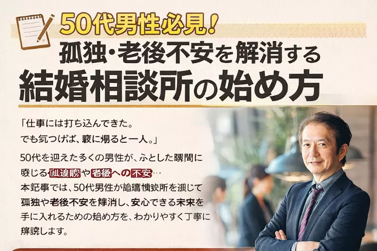 「仕事には打ち込んできた。でも気づけば、家に帰ると一人。」50代を迎えた多くの男性が、ふとした瞬間に感じる孤独感や老後への不安。体力や健康、親の介護、定年後の生活——これらが現実味を帯びてくる年代だからこそ、「このまま一人でいいのだろうか?」と考え始める方は少なくありません。本記事では、50代男性が結婚相談所を通じて孤独や老後不安を解消し、安心できる未来を手に入れるための始め方を、わかりやすく丁寧に解説します。①日常に会話がない孤独若い頃は仕事中心の生活でも気にならなかった「一人時間」。しかし50代になると、仕事の責任が落ち着く友人との付き合いが減る家族を持つ同世代が増えるこうした変化により、話し相手がいない寂しさがじわじわと心に広がります。②老後を一人で迎える現実的な不安老後の不安は、漠然としているようで実はとても具体的です。病気になったとき頼れる人がいない入院・手術時の保証人退職後の生活の張り合い孤独死への恐怖これらは決して大げさな話ではなく、現実として多くの独身男性が直面している問題です。50代男性の多くが口にする言葉があります。「もう年齢的に無理だろう」しかし、これは大きな誤解です。実は50代から結婚する男性は増えている結婚相談所の現場では、50代で初婚50代で再婚同世代同士の穏やかな結婚こうした成婚事例は珍しくありません。理由は明確です。結婚に対する目的がはっきりしている条件より「安心感」「人柄」を重視する女性が多い経済的・精神的に安定している男性が多い若さではなく、人生経験そのものが魅力になる年代なのです。①効率的に「結婚前提」の出会いができるマッチングアプリや婚活パーティーでは、真剣度が分からない年齢で敬遠されるメッセージだけで疲弊するといった問題が起こりがちです。一方、結婚相談所は最初から「結婚したい人」しかいない場所。時間も気力も無駄にしません。②年齢を理解したサポートが受けられる50代男性の婚活には、若い世代とは違う悩みがあります。自分の強みの伝え方年齢差への不安再婚・子ども・親の問題結婚相談所では、同世代の婚活を熟知したカウンセラーが寄り添いながら進めてくれます。③一人で悩まなくていい安心感婚活で一番つらいのは「一人で考え込むこと」。結婚相談所なら悩みを相談できる客観的なアドバイスがもらえる軌道修正ができるこの伴走型サポートが、50代男性には特に大きな支えになります。ステップ①「なぜ結婚したいのか」を整理する条件を考える前に大切なのは、結婚したい理由を言語化することです。例)老後を一人で過ごしたくない安心できるパートナーがほしい誰かのために時間を使いたいこの軸が定まると、婚活は驚くほどスムーズになります。ステップ②自分の「今」を正しく伝える50代の婚活では、無理に若く見せる必要はありません。安定した生活穏やかな性格誠実さ健康への意識これらは同世代女性にとって非常に魅力的なポイントです。ステップ③プロの力を借りる自己流で婚活を続けると、同じ失敗を繰り返す自信を失う諦めてしまうという流れに陥りがちです。結婚相談所は、遠回りを防ぎ、最短で安心できる未来へ導く場所です。結婚の価値は、若い頃の「ときめき」だけではありません。50代以降の結婚は、何気ない会話一緒に食べる食事体調を気遣い合う日常こうした当たり前の積み重ねが、孤独や不安を少しずつ消してくれます。「誰かがいる」それだけで、人生の景色は大きく変わります。過去は変えられません。でも、これから先の時間は自分で選べます。このまま一人で年を重ねるのか誰かと支え合う人生を選ぶのかその分かれ道は、「今」です。50代男性の婚活は、決して遅くありません。むしろ、本当に大切なものが分かっている今だからこそ、幸せな結婚ができる年代です。孤独や老後不安を一人で抱え込まず、ぜひ結婚相談所という選択肢を考えてみてください。マリアージュ幸は、50代男性の婚活を全力で応援していますマリアージュ幸では、50代男性の婚活に特化したサポート同世代との安心できる出会い無理のないペースでの伴走型支援を大切にしています。「誰かと一緒に生きる安心」を、これからの人生に。あなたの新しい一歩を、私たちは心から応援します。関連記事はこちら出会いがない50代独身男性へ 婚活で結婚を叶える方法再婚・初婚も叶う!50代独身男性が結婚相談所を選ぶべき理由50代独身の婚活は難しい?結婚できる人・できない人の違いLINEでのお問い合わせはこちら▶︎ https://line.me/ti/p/DnGCfzK_LU インスタでのお問い合わせはこちら▶https://www.instagram.com/mariagesachi?igsh=MW91bmwwcHFnaHlydA==