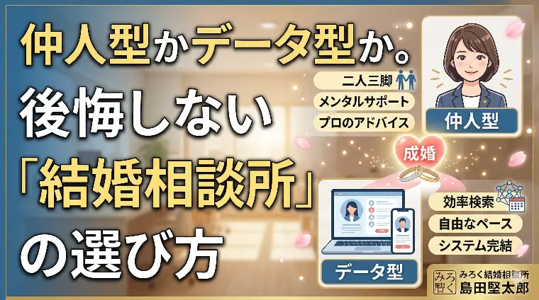こんばんは。千葉県船橋市・外房エリアを中心に、全国の婚活をサポートしております、みろく結婚相談所の島田です。昨日のブログでは、マッチングアプリの「嘘」や「リスク」という、少し厳しい現実についてお話しさせていただきました。読んでくださった方からは、「身を守る大切さが身に染みた」という切実な反響も届いています。「じゃあ、安心できる場所で始めたいけれど……よく聞く『仲人型』と『データ型』って、一体何が違うの?」今日は、そんなあなたの迷いをスッキリ解決するために、仲人型結婚相談所の「真実」と、後悔しない選び方のポイントを詳しくお伝えします!「二人三脚」か「セルフサービス」の決定的な差結婚相談所には大きく分けて2つのスタイルがありますが、その違いを一言で言うなら、「成婚までの伴走者がいるかいないか」です。システムが条件に合う人を自動でピックアップ。お相手探しから交際まで、基本は自分一人で進めるスタイル。「自分のペースで、手軽に安く進めたい」という方向けです。専任の仲人が、あなたの性格や価値観を深く理解した上で、データだけでは見えない「相性」を考慮して手作業でお引き合わせ。お見合い調整から交際中の悩み、プロポーズのタイミングまで、常に横で並走します。例えるなら、「セルフのガソリンスタンド」か、「プロのドライバーが教習してくれるプライベートレッスン」か、というくらいの違いがあります。「システムでマッチングすれば十分じゃない?」と思うかもしれません。ただ、婚活の現場で起きる「すれ違い」は、システムでは解決できないことも多々あります。例えば、こんな経験はありませんか?「デートの返信が遅いけど、相手はどう思っているんだろう……」「いい人だけど、結婚観について切り出しにくいな……」データ型ではここで一人で悩み、フェードアウトしてしまうケースがほとんど。しかし、仲人型なら「仲人同士の裏連携」が発動します!私が相手側の担当者に「Aさんはこう仰っていますが、お相手のお気持ちはどうですか?」と確認。相手の本音を探り、誤解があれば解き、成婚に向けて橋渡しをします。この「人の手」による介入があるからこそ、仲人型は成婚率が圧倒的に高いのです。仲人型は、データ型に比べて「成婚料」という費用がかかることが多いです。これ、実は「最後まで責任を持つ」というプロの証。データ型は「入会してもらうこと」が目的になりがちですが、仲人型は「結婚して卒業していただくこと」が共通のゴール。あなたが幸せな家庭を築くその瞬間まで、私たちは文字通り「二人三脚」でサポートします。「安く始めて、ダラダラと時間だけが過ぎてしまう」よりも、「プロと一緒に、最短距離で運命の人を掴み取る」。結果として、お金も時間も、そして何より「心」の消耗を最小限に抑えられるのが仲人型の価値です。もし、あなたが今こんな風に感じているなら……恋愛経験が少なくて、進め方に自信がない仕事が忙しくて、効率よく「本当に合う人」だけに出会いたい過去にアプリやデータ型で「一人で頑張る限界」を感じたそれなら、迷わず「仲人型」の扉を叩いてください。昨日お話しした800万円の被害に遭われたAさんも、仲人型という「身元が保証され、プロが守ってくれる環境」を選んだからこそ、どん底から這い上がり、真実の幸せを掴み取ることができました。「一人で戦う婚活」は、もう終わりにしませんか?あなたの誠実な想いを、プロの経験と情熱でしっかりと形に変えていきます。「自分にはどっちが合ってるのかな?」そんな些細な悩みでも構いません。あなたの「幸せな未来」への第一歩を、私と一緒に踏み出しましょう!千葉県船橋市・外房エリア(全国オンライン対応)みろく結婚相談所 島田堅太郎▼みろく結婚相談所(公式サイト)369-miroku.jp▼LINElin.ee/PNxwv4U▼Instagraminstagram.com/369_miroku369?igsh=b3ZtZnlvN2k4NGhz&utm_source=qr外房エリアの相談が増えています大網・茂原・いすみ・東金・成東・山武・上総一宮・匝瑳・・・