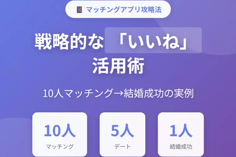 結婚相談所を運営していると、自然と身近な人から恋愛相談を受けることがあります。先日、ある男性友人から聞いたマッチングアプリの成功法に衝撃を受けたので、ぜひ皆さんにシェアさせてください。多くのマッチングアプリでは、女性は無料で利用できますが、男性は有料プランに加入する必要があります。男性が支払った金額に応じて、「いいね」できる数やメッセージのやりとり数が付与される仕組みです。ここで重要になってくるのが、いいねの数をどう活用するかという点です。友人が教えてくれたのは、まず「いいねをもらう」ことに注力するという方法でした。女性は、いいねが多い男性からいいねが届くと「この人は人気なんだ」と感じ、いいねを返してくれる確率、つまりマッチング率が高まるというのです。でも、いいねは自分から送るものなのに、どうやっていいねをもらうように仕向けるのか。私も最初は不思議でした。友人がまず実践したのは、あまりいいねをもらっていない女性や、顔写真を掲載していない女性に積極的にいいねを送るという方法でした。こうした女性は、いいねをもらえたこと自体が嬉しくて、いいねを返してくれる可能性が高いそうです。逆に、すでに多くのいいねをもらっている人気の女性にいいねを送っても、返ってくる可能性は低く、貴重ないいねの数を消費するだけで効率が良くないとのこと。(ちなみに、このステップでマッチングしても、友人はメッセージを送らず、本当にいいね稼ぎのためだけに利用していたそうです…)ある程度いいねを返してもらい、プロフィールのいいね数が増えてきたら、いよいよ気になる女性にいいねを送ります。ただしここでも戦略は続きます。超人気の女性に振り向いてもらうのは難しいので、いいねを超たくさんもらっている女性は避け、自分に振り向いてくれそうで、自分も気になる女性を選んでいいねを送るそうです。この方法で友人は、10人とマッチングし、5人とデートをして、1人とお付き合いを始めました。そして、そのお付き合いした女性と結婚までされています。ここまで戦略的に行動できる人がマッチングアプリで結婚できるんだなと、もう尊敬のまなざしです。考えてみれば、マッチングアプリで彼氏を作った女性の友人も、「この期間で何人と会う」と活動量を決めて取り組んだ結果、彼氏ができていました。やはり目標設定と活動量の管理が、婚活成功の重要な要素なんだと痛感しました。(結婚に限らず何でもそうですよね)このお話を聞いて、「自分にもできそうだな」と思われた方は、マッチングアプリが向いていると思います。ぜひチャレンジしてみてください。でも、「自分で管理して行動するのは難しい」と感じた方には朗報があります!結婚相談所Marriableでは、カウンセラーがあなたと一緒に目標を考え、活動量の振り返りや次に向けた行動の検討などを月1〜2回の定期面談で行います。1人ではできなくても、一緒に伴走してくれるカウンセラーがいるので大丈夫です。1人でジムに通うのは難しくても、パーソナルトレーニングであれば続けられる。そしてトレーニング内容もあなたの目的に合わせてカスタマイズされている。結婚相談所も、それと同じです。あなたに合った婚活スタイルで、素敵なパートナーとの出会いを見つけてください。<結婚相談所Marriable>代表カウンセラーが20代で、気軽に相談できるとご好評をいただいております。LINE相談24時間無料、毎日22時まで営業しているので仕事終わりに気軽に婚活相談が可能です。価値観が合うお相手と最短期間で成婚していただけるよう、データを分析して根拠のある具体的な婚活戦略を提案することを大切にしております。