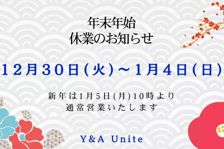 平素よりY&AUniteをご利用いただき、誠にありがとうございます。本年も多くの方とのご縁を通じて、「結婚」という人生の大切な節目に寄り添わせていただけたこと、心より感謝申し上げます。婚活には、不安や迷い、期待や喜びなど、さまざまな想いが交差します。その一つひとつに向き合いながら、会員様と一緒に歩ませていただいた一年となりました。誠に勝手ながら、下記の期間を年末年始休業とさせていただきます。2025年12月30日(火)〜2026年1月4日(日)※2025年12月29日(月)は19時までの営業となります※2026年1月5日(月)は10時より通常営業いたします休業期間中にいただきました「お問い合わせ」・「無料相談のご予約」・「各種ご連絡」につきましては、営業再開後、順次ご対応させていただきます。なお、既存会員様につきましては、緊急のご相談等がございましたら、公式LINEまたは個別の連絡手段にてご連絡ください。本年、Y&AUniteを信頼し、大切な婚活をお任せいただいたことに改めて深く御礼申し上げます。来年も当相談所の理念(UnitewithHeart)のもと、人生経験を活かし、思いやりをもって、一人ひとりに寄り添う婚活サポートを行ってまいります。新しい一年が、皆さまにとって実り多く、温かいご縁に恵まれる一年となりますよう、心よりお祈り申し上げます。どうぞ良い年末年始をお過ごしください。