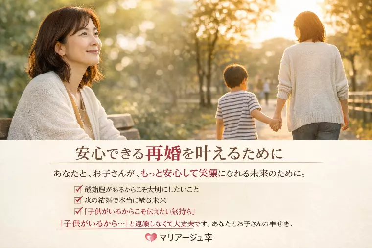 「もう一度、誰かと人生を歩みたい」そう思ったとき、心のどこかでこんな不安がよぎりませんか?また同じ失敗を繰り返したらどうしよう自分を理解してくれる人に出会えるのだろうか年齢や離婚歴で不利にならないだろうか再婚を考える人ほど、軽い気持ちでは動けません。だからこそ、多くの再婚希望者が“ある選択”にたどり着いています。それが、結婚相談所です。再婚を目指す婚活には、初婚とは違う難しさがあります。出会いの温度差マッチングアプリや日常の出会いでは、相手は本当に結婚を考えているのか再婚への理解があるのかが見えづらく、気持ちのズレに疲れてしまうことも。本音を出しづらい離婚理由や過去の経験を、「いつ、どう伝えるべきか」悩み続けてしまう方も少なくありません。一人で判断し続ける不安この人でいいのかもっと合う人がいるのではないか相談相手がいないまま婚活を続けるのは、想像以上に消耗します。ここで一つ、はっきりお伝えしたいことがあります。再婚を考えている時点で、あなたはとても前向きです。過去を経験したからこそ、次は穏やかな関係を築きたい安心できるパートナーがほしいそう思えるようになったのです。問題は「気持ち」ではなく、その想いをどう現実に変えるかです。理由①最初から「結婚の意思」が揃っている結婚相談所に登録している人は、結婚を前提に出会いたい遊び目的ではないという点で共通しています。だからこそ、「時間を無駄にしない婚活」が可能になります。理由②再婚への理解がある出会い結婚相談所では、再婚希望者再婚に理解のある初婚者が多く活動しています。離婚歴が理由で遠慮したり、必要以上に自分を下げたりする必要はありません。理由③一人で悩まなくていい婚活は、決断の連続です。相手選び交際の進め方不安や迷いこれを一人で抱え続けるのは大変です。結婚相談所では、第三者の視点で冷静なアドバイスを受けながら進められます。以前は、「結婚相談所はモテない人が行く場所」そんなイメージがありました。しかし今は違います。忙しい人失敗したくない人人生設計を大切にしたい人“賢く結婚したい人”ほど選ぶ場所に変わっています。特に再婚では、「勢い」より「確実性」が何より重要です。実際に成婚される方に共通しているのは、自分一人で何とかしようとしない正しい環境に身を置く決断ができるプロのサポートを素直に活用できるという点です。これは決して「弱さ」ではなく、人生を大切にしている証拠です。「まだ早いかな」「もう少し一人で頑張ってみようかな」そう思う気持ちも自然です。でも、迷っている時間が一番もったいないというのも事実。話を聞くだけでも、自分の状況が整理できる婚活の方向性が見えるそんなケースは多くあります。再婚は、やり直しではありません。より自分らしい人生を選び直すことです。焦る必要はありません。でも、一人で抱え込む必要もありません。マリアージュ幸は、再婚を本気で考えるあなたの味方ですマリアージュ幸では、再婚希望者の想いと不安に寄り添いながら、「安心できる結婚」を目指したサポートを行っています。✔離婚歴があるからこそ大切にしたいこと✔次の結婚で本当に望む未来それを一緒に整理するところから、始めてみませんか?あなたの新しい人生の一歩を、私たちは心から応援しています。関連記事はこちら結婚相談所では再婚者は成功しやすいって本当?その理由と成功の秘訣とは再婚はやり直しじゃない 新しい人生のスタートです「もう一度笑顔に!」離婚経験者が結婚相談所で再び愛を見つける方法LINEでのお問い合わせはこちら▶︎ https://line.me/ti/p/DnGCfzK_LU インスタでのお問い合わせはこちら▶https://www.instagram.com/mariagesachi?igsh=MW91bmwwcHFnaHlydA==
