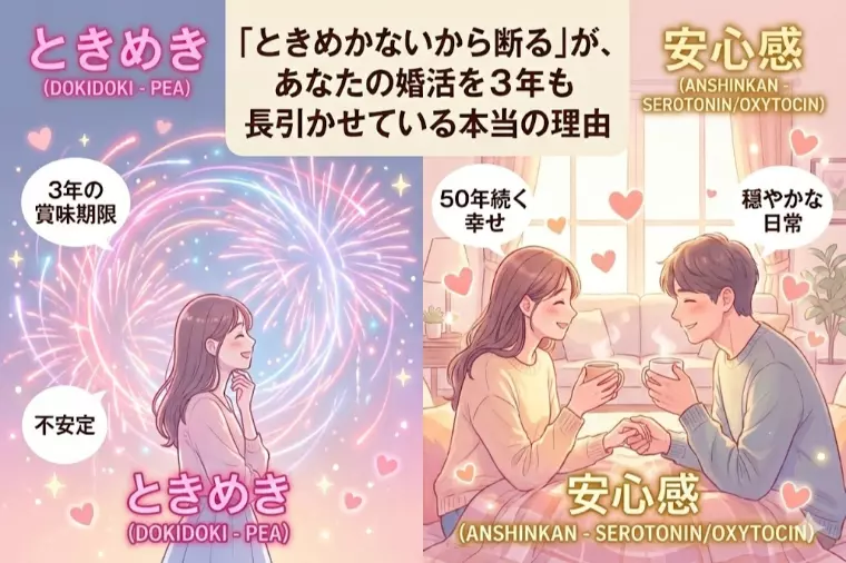 「ときめかないから断る」が、あなたの婚活を3年も長引かせている本当の理由カウンセリングをしていると、非常に優秀で魅力的な女性から、必ずと言っていいほどこの言葉が出てきます。「条件は完璧なんです。いい人だとも思います。でもときめかないんです」そして、多くの方が「生理的に好きになれない」「ドキドキしない」という理由で、せっかくの良縁を自ら手放してしまいます。今日は、心理カウンセラーの視点から、少し衝撃的な事実をお伝えします。もしあなたが「ときめく相手」を探して婚活をしているなら、その婚活は失敗する確率が極めて高いです。なぜ「恋愛感情」を信じてはいけないのか。脳科学と心理学のメカニズムを知れば、あなたの「相手選びの基準」が今日から劇的に変わるはずです。私たちは「ドキドキすること」=「愛」だと勘違いしがちです。しかし、このドキドキの正体は、脳内から分泌されるPEA(フェニルエチルアミン)という神経伝達物質の影響にすぎません。恋愛は「一時的な精神錯乱」であるPEAは別名「天然の麻薬」とも呼ばれ、食欲を減退させたり、相手の欠点を見えなくさせたりする作用があります。「恋は盲目」というのは、比喩ではなく脳科学的な事実なのです。しかし、残酷な真実があります。このPEAの分泌は、長くても3年、早ければ数ヶ月で枯渇します。つまり、「ときめき」を基準に結婚相手を選んだ場合、3年後にはその根拠(ドキドキ)が消失し、相手の嫌なところばかりが目につくようになる。これが「恋愛結婚の離婚率」が意外と高い原因の一つです。婚活で探すべきは「ドーパミン」ではなく「セロトニン」では、何を探せばいいのでしょうか。結婚生活は3年では終わりません。30年、50年と続きます。そこで必要なのが、「セロトニン(安心・癒やし)や「オキシトシン(絆・信頼)」を感じられる相手です。一緒にいてドキドキはしないけれど、沈黙が苦にならない。LINEの返信が遅くても、不安にならない。格好良くはないけれど、隣にいると呼吸が深くなる。これらは「恋」ではありません。「愛」の原石です。多くの女性は、この**「セロトニン的な幸福」を「物足りない」と切り捨ててしまっている**のです。「でも、どうしてもダメな男性ばかり好きになってしまうんです」そう嘆く女性もいます。実は、これも心理学で説明がつきます。「不安定さ」を「恋」と誤認していませんか?心理学には**「間欠強化(かんけつきょうか)」**という用語があります。「いつも優しい」よりも、「冷たい時と優しい時の差が激しい」方が、脳は強く報酬を感じ、依存してしまう現象です。連絡が来たり来なかったりする男性。振り回してくる男性。彼らに惹かれるのは、運命でも相性がいいからでもありません。単に、脳がギャンブルのような刺激(不安と安堵のアップダウン)に依存しているだけです。一方、結婚相談所にいる誠実な男性たちは、常に安定して優しい。だから、脳が「刺激不足」と判断し、「ときめかない」というレッテルを貼ってしまうのです。「つまらない」と感じるその相手こそが、実は心理学的に見て「最強のパートナー」である可能性が高いのです。とはいえ、「生理的に無理なものは無理!」という気持ちも分かります。ここで重要なのは、その拒否反応が「本能的な警告」なのか「単なる防衛本能(ブロック)」なのかを見極めることです。危険な「生理的無理」と、乗り越えるべき「生理的無理」1.清潔感・ニオイ・マナーに関する嫌悪感これは「本能的な警告」です。遺伝子レベルで相性が悪い、あるいは生活レベルが合わないサインですので、無理をする必要はありません。即お断りでOKです。2.「距離を縮められること」への恐怖問題はこちらです。相手が好意を寄せてくれた途端に気持ち悪くなる(蛙化現象)。これは相手の問題ではなく、あなた自身の「回避愛着スタイル(親密になることへの恐れ)」が原因かもしれません。「傷つくのが怖い」「自分を知られるのが怖い」という無意識のブレーキが、相手を「無理」だと決めつけて遠ざけているだけではないでしょうか?もし心当たりがあるなら、一度立ち止まってみてください。その「無理」の壁の向こう側にこそ、本当のパートナーシップが待っていることがあります。ブログの冒頭で、少し厳しいことを言いました。しかし、これを知ったあなたはもう、不毛な「青い鳥探し」から卒業できます。結婚生活とは、非日常の連続ではありません。病気の時に看病し合えるか。老後の資金について冷静に話し合えるか。何もない休日に、二人でスーパーに行って「卵が高いね」と笑い合えるか。そんな「地味で退屈な幸せ」を共有できる相手こそが、あなたの人生を豊かにしてくれます。次のお見合いでチェックすべき「たった一つ」のこと次回のお見合いでは、相手に「ときめくか」を確認するのはやめましょう。その代わりに、こう自問自答してください。「この人は、私が風邪で