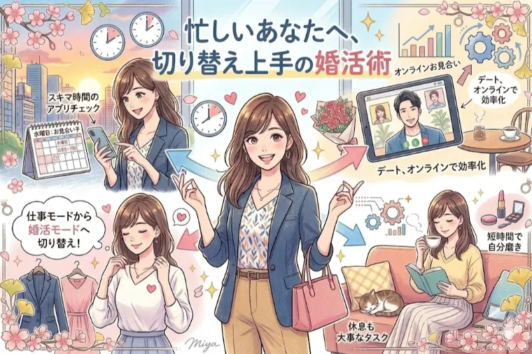 忙しいあなたへ切り替え上手の婚活術これは30代・40代の方から最もよく聞く言葉の一つです。確かにこの年代は、仕事でも責任が増え、生活も忙しくなります。管理職になったり、部下を持ったり、家庭のことを考えたり。毎日があっという間に過ぎていく方も多いでしょう。しかし、ここで一つ考えてみてください。忙しい人ほど、実は時間の使い方が上手いという事実があります。例えば「副業」です。最近は本業とは別に副業をする人が増えました。副業をしている人は、決して暇な人ではありません。むしろ本業で忙しい人ほど、副業にも挑戦しているケースが多いのです。なぜそれができるのでしょうか。その理由はシンプルです。“切り替え”が上手いからです。仕事の時間は仕事に集中する。副業の時間は副業に集中する。このように頭のスイッチを切り替えることで、限られた時間の中でも成果を出しているのです。実は、婚活もこれと同じです。婚活がうまくいく人は、特別に時間があるわけではありません。忙しい中でも、婚活の時間をしっかり切り替えて作っている人なのです。例えば、・仕事が終わった後の1時間は婚活の時間にする・週末のどこかで必ずお見合いを入れる・通勤時間にプロフィールをチェックするこのように、ほんの少しの時間でも婚活に使うことで、出会いのチャンスは大きく変わります。逆に婚活が進まない人の多くは、「時間ができたらやろう」と考えています。しかし残念ながら、時間は自然には生まれません。だからこそ大切なのが、切り替え力なのです。仕事は仕事。婚活は婚活。このスイッチをしっかり持つことで、忙しい人でも出会いを増やすことができます。もう一つ重要なのは、完璧を求めすぎないことです。「時間がないから今日はやめよう」「疲れているから来週にしよう」この考え方をしてしまうと、婚活はどんどん後回しになります。大切なのは、少しでも行動することです。10分プロフィールを見る。1人申し込みをする。1回お見合いをする。小さな行動の積み重ねが、未来のご縁につながります。実際、結婚が決まる方の多くは、行動量が多い人です。そして行動量を作っているのは、時間ではなく、意識の切り替えなのです。忙しい人ほど、人生の時間の価値をよく知っています。だからこそ「仕事」「副業」「恋愛」などを上手に切り替えています。婚活も同じです。特別な時間が必要なわけではありません。必要なのは、ほんの少しの勇気と切り替えです。忙しい毎日の中でも、誰かと過ごす未来を考える時間は、とても大切なものです。人生は仕事だけではありません。誰と生きていくかで、人生の景色は大きく変わります。もし今、「忙しいから婚活は無理かもしれない」そう思っているなら、それは時間の問題ではなく、切り替えの問題かもしれません。忙しいあなたにこそ知ってほしいのが、切り替え上手の婚活術です。ほんの少しの意識を変えるだけで、出会いのチャンスは確実に増えていきます。未来のパートナーは、行動した人のところにしか現れません。忙しい毎日の中でも、あなたの人生を一緒に歩む人を見つけるために。今日から少しだけ、婚活のスイッチを入れてみませんか。もし「忙しくても婚活できる方法を知りたい」「効率よく婚活したい」そんな方は、ぜひ一度ご相談ください。AiraMarieでは無料カウンセリングを実施しています。👉 https://lin.ee/buLOx3T LINEよりお気軽にご連絡ください。あなたに合った婚活の進め方を一緒に考えさせていただきます。✨