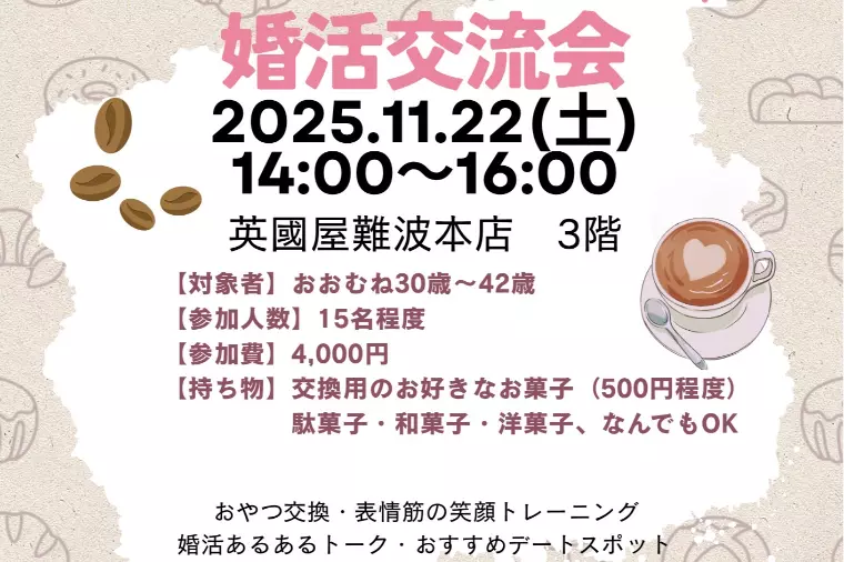英國屋難波本店で「婚活交流会」開催!好評につき第3弾!IBJ正規加盟店主催の婚活交流会を、2025年11月22日(土)14:00〜16:00/英國屋難波本店3階にて開催します☕🍰今回のテーマは、「婚活のリアルを語り合おう」。これから婚活を始めたい方も、すでに活動中の方も、「異性の意見を直接聞いてみたい!」という方にぴったりのイベントです。たとえば、重複交際って実際どう感じる?デート代はどちらが出す?お見合い後のLINEの頻度は?など、普段なかなか聞けない“異性の本音”を、グループトークで楽しく話し合える時間を設けています。「何が正解か」ではなく、「自分と合う価値観を見つける」ことが大切。そうしたリアルな意見交換の中から、自然とフィーリングの合う相手と出会えるかもしれません。おやつ交換、ケーキ・ドリンク付き、1対1トークや手相占いなどのプログラムも盛りだくさん✨お気軽にお問い合わせください。あなたの“本音の婚活”を応援します!📅開催概要日程:2025年11月22日(土)14:00〜16:00場所:英國屋難波本店3階対象:おおむね30〜42歳定員:約15名参加費:4,000円持ち物:交換用のお菓子(500円程度/駄菓子・和菓子・洋菓子など自由)詳しくは町のブライダルミューナまでお問合せください。 https://www.bridal-myuna.jp/