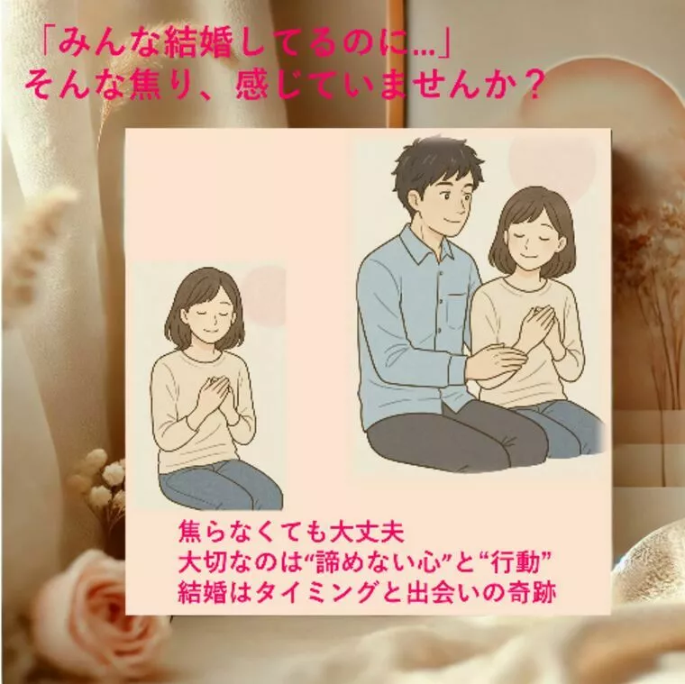 人生のタイミングは人それぞれです。焦って選ぶより、“自分らしく笑える未来”を大切にしてほしい。ゆっくりでいい、一歩ずつで大丈夫です。「もう少し頑張らなきゃ…」そう思って自分を責めていませんか?でもね、焦らなくても大丈夫。大切なのは“諦めない心”と“継続行動”結婚はタイミングと出会いの奇跡。信じて動く人に、ちゃんとチャンスはやってきます。「この人だ」と感じる瞬間は、ある日ふっと訪れます。それは“頑張ること”を手放して、“自分らしく生きていた時”にやってくるもの。焦らずに歩いてきたあなたの道が、ちゃんと運命へつながっていましたね。当結婚相談所は、少人数会員制でサポートを行っております冠婚葬祭に精通し、たくさんの新郎新婦を見てきた元式場支配人がサポートを行いますご相談は無料ですので、是非お気軽にお問合せくださいませ!