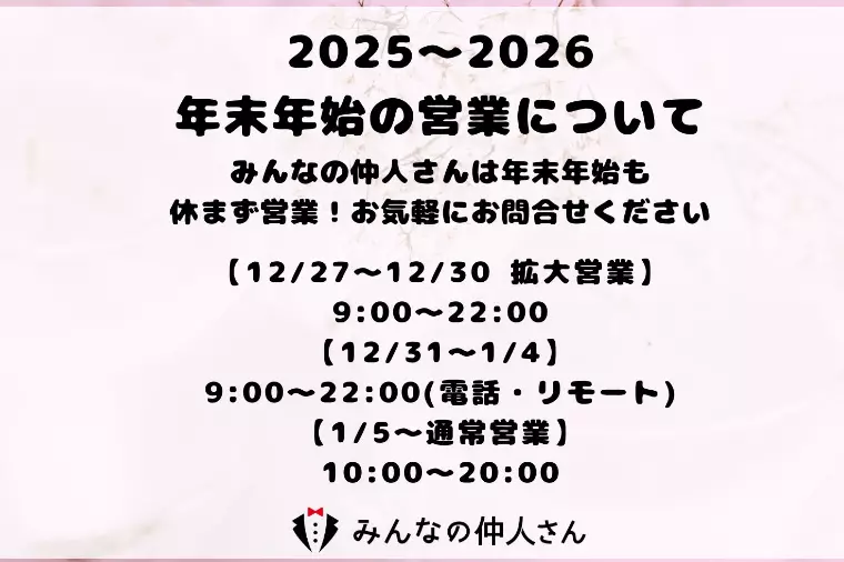 お世話になります。本日で仕事納めという方も多かったのではないでしょうか。今年一年、本当にお疲れ様でした。婚活サポートみんなの仲人さんは今年も休まずあなたの結婚のために婚活をサポートをしますそして、なんと拡大営業もしますので、よろしくお願いいたします!一部、電話・リモート対応の日がございますのでお気をつけください【2025年12月27日~30日】拡大営業9:00~22:00【2025年12月31日から2026年1月4日】拡大営業(電話・リモート)9:00~22:00【2026年1月4日~】通常営業再開10:00~20:00年末年始は家族や親戚で新年会をしたり、地元の友人、同窓会など、会合が多いかと思いますそこで必ず出る話題『ところで結婚したの?』という、毎回ながら婚活中の人には耳が痛い質問がでると思いますそこで、まだ結婚してないなんて答えたものならモテないだの大きなお世話なことをああでもないこうでもない言われますでは、なぜあなたは結婚できないのか?“それはあなたがモテないのではなく、あなたのやり方に問題があるからです”だからこそ、結婚のプロのサポートが必要なのですそろそろ、当社にお任せしませんか?婚活で苦労した私たちはあなたにストレスなく幸せな結婚をして欲しいのです!まずは無料カウンセリングをご利用くださいカウンセリングを申し込まれた全員に豪華ノベリティをプレゼント!お待ちしております!無料カウンセリングは「こちら」からお申込みください