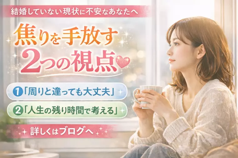 年末年始に友人の近況を聞いて、「周りもどんどん結婚していくし、私もそろそろ……」「もう30歳、35歳。いい加減結婚しないとやばいかも」と、焦りや不安を感じていませんか?周りが同じようなライフステージに進んでいく中で、自分だけが違う場所にいると、「このままで大丈夫なのかな」と不安になるのは自然なことです。でも、その不安はあなたの人生が間違っているからではなく、ただの「思い込み」から来ているかもしれません。今日は、その不安を乗り越えるための2つの考え方をお伝えします。これまでの人生を少し振り返ってみてください。受験や就職のとき、こんな風に思いませんでしたか?「志望校に受からないと、人生終わりだ」「いつまでに内定をもらわないと、社会から脱落する」当時は必死だったはずです。でも、今になって考えてみてください。もし第一志望ではなかったとしても、あるいは就職が決まるのが人より少し遅かったとしても、そのせいで今のあなたが「取り返しのつかないほど不幸」になっていますか?おそらく、今の場所でそれなりに楽しく、あるいは一生懸命に自分の人生を歩んでいるはずです。「もし今でも受験の失敗を引きずって毎日泣いています」という人がいたら、それはもう「気にしすぎだよ!」と笑って言えるレベルですよね(笑)。人生は、「みんなと同じレールに乗らなければ幸せになれない」という幻想でできています。そのレールから外れても、人生は続いていくし、幸せの形はいくらでもあるのです。もう一つの視点は、少しユニークな「時間の捉え方」です。誰かと自分を比較して「あの子は早く結婚して、子供もいていいな」と思うとき、私たちは無意識に「生まれたとき」を基準に考えています。しかし、視点を変えて**「残された人生」をベース**に考えてみましょう。例えば、早くに結婚して完璧な人生に見える友人が、もしも10年後に人生を終える運命だとしたら。対して、あなたがその後50年生きるとしたらどうでしょうか。「今」という地点を人生全体の割合で見たとき、その友人はすでに人生の終盤にいますが、あなたはまだ半分も来ていないことになります。つまり、「早く進んでいる」ように見えても、人生の割合で見ればあなたと同じ地点、あるいはあなたの方がまだ新しい経験を始める余裕があるということかもしれません。誰がいつまで生きるかは誰にも分かりません。だからこそ、他人と比較して「早い・遅い」を競うことにはあまり意味がないのです。周りと違うことに不安になる必要はありません。それよりも怖いのは、焦って自分に合わない選択をし、その先に本当の不幸が待っていることです。結婚はタイミング。そして、人それぞれの「人生の割合」があります。焦らず、あなたのペースで、あなたらしい幸せを見つけていきましょう!幸せな結婚をとことん追求することをモットーに、20代30代の会員様をメインに婚活サポートをしています。オンラインでの定期面談やLINEでのお悩み相談など、柔軟なサポートを心がけています。お気軽にご相談ください。・ホームページ・Instagram・Youtube・LINE・相談所乗り換えキャンペーン2026年4月末まで、他の相談所様からの乗り換えの場合は入会金を3万円割引いたします。・バレンタイン入会特典2026年2月14日~2026年3月13日までパーソナルカラー診断と骨格診断を無料で受けていただけます。