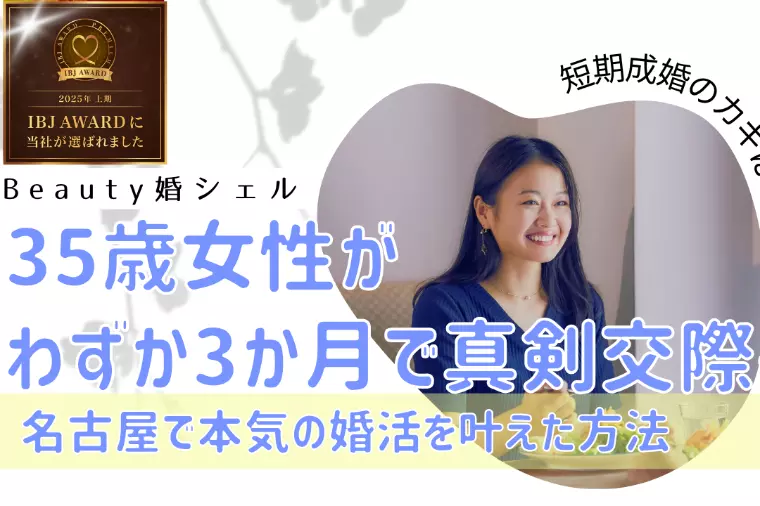 -------------------------------\1分で簡単/☆カウンセリングWEB予約 https://reserva.be/beautyconcier (こちらからカウンセリングの空き状況をご確認いただけます)-------------------------------ネットでの情報では、「34歳からの婚活は厳しい…」 とかかれているものも多く、不安を感じている女性も多いと思います。でも実際に結婚祖相談所で活動を始められる女性は30代後半から増えてきます。本日のブログでは、35歳で入会し3か月で真剣交際へ進んだエピソードとともに、短期でご成婚を叶えるコツを書いています。「そろそろ私も真剣に婚活を始めたい」と思っている方へ役立つ内容になっていますので、是非最後までご覧ください。blog35歳女性が3ヶ月で真剣交際へ。名古屋で“本気の婚活”を叶えた方法↑↑↑ こちらから是非ご覧ください結婚は運や縁だけではない"遠慮なく自分らしく活動出来る環境をご用意しています"どんな時も大切な会員様にどんな言葉を掛けてあげられるか、「今、どういう言葉が力になるだろう、」そんなことを考え、日々の会員様サポートにあたっています。人それぞれ受け取り方が違うから言葉は本当に難しいのですが、そのために「会員様をよく知ること」を大切に考えてご入会から一緒に歩んできています。Beauty婚シェルはたくさんのご成実績とすべての経験、ノウハウをお一人お一人に会員様に尽くします。「1年で結婚を叶えたい!」「新しい気持ちで活動スタートしたい!」年内に良いご縁を結びたいと考えている方、まだ遅くありません。是非一緒にBeauty婚シェルで真剣婚活をスタートしませんか^^Beauty婚シェルはご縁のある皆さまを幸せにします。ご相談をお待ちしております。三谷\今回のブログを書いたのは/筆者:三谷 友香理(みたにゆかり)「結婚相談所Beauty婚シェル名古屋」の代表カウンセラー。名古屋駅・栄を拠点に30代女性を中心とした婚活サポートを行う。コミニュケーション力や「見た目の魅力」を高めるパーソナルサポートを大切にし、これまでに多数の成婚をサポート。自身も30代での結婚を経験しており、実体験に基づいたリアルなアドバイスに定評がある。「結婚を焦らず、でも後悔しない婚活をしてほしい」そんな想いで、名古屋の女性たちに向けて婚活のヒントや成功事例を発信中。▶️無料カウンセリングのご案内はこちら🌸ご成婚者様の声🌸 https://beautyconcier.com/voice/ 多くのお見合いが組める会員様は、必然的にご成婚が決まっていきます。Beauty婚シェルでは、【出会いを惹きつけるプロフィールとお見合い写真】にこだわっており、ご入会後1か月以内に100%すべての方がお見合いを叶え、その後90%以上の方が1か月以内に交際に進まれています。少人数制で交際サポートも丁寧に行っており、困った事やお悩みなどに対してしっかりとプロのアドバイスをお伝えしながら成婚までお繋ぎしています。▷他の結婚相談所とはココが違う!『IBJAWARD連続表彰実績』名古屋の"実力派結婚相談所"