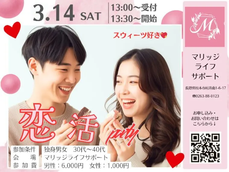 パートナーができたら素敵なカフェに行って、二人でケーキを食べたりお話ししたりっていうデートは誰もが一度は考えた事があるはず。そんなデートをしたい人や甘いの好きな方には最適の出会いになると思います!みなさん、こんにちは。長野県の婚活応援団マリッジライフサポートの大野です。バレンタインが終わると何となくホワイトデーが頭に浮かぶ方もいると思います。今回はホワイトデーを甘い出会いの場として恋活パーティーを開催します。既に数名の方からお申込みをいただいております。春に向けて一緒に楽しめるお相手を見つけませんか?当日は、私、大野が司会進行で楽しい時間となるよう頑張ります!!是非お気軽にご参加くださいね。詳細・お申込みはマリッジライフサポートのHPをご覧ください。~~お申込み後に公式LINEのお友達登録で500円サービスチケットプレゼント中~~女性は先着順となっておりますのでお早目にお申込みくださいね。お待ちしてます♪