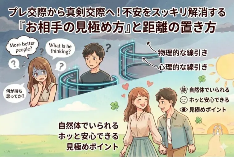プレ交際から真剣交際へ!不安をスッキリ解消する「お相手の見極め方」と距離の置き方結婚相談所での婚活において、多くの方が悩み、立ち止まってしまうのが「プレ交際(仮交際)」の期間です。複数の方と同時進行でお会いできるこの時期は、運命のお相手を見つけるための大切な助走期間。しかし、ワクワクする気持ちと同じくらい、「本当にこの人でいいのかな?」「相手はどう思っているんだろう?」と、不安やモヤモヤでいっぱいになってしまう方も少なくありません。今回は、プレ交際中に生まれる不安をどうやって解消し、お相手の「本質」をどう見極めて理想の結婚へと繋げていくのかを分かりやすく解説します。プレ交際で足踏みし、不安になってしまうのには理由があります。まずは、自分が何に対して不安を感じているのか、その正体を知ることから始めましょう。プレ交際では複数人とお見合いやデートができるため、選択肢が多いからこそ「誰を選べばいいか分からない」という不安が生まれます。「この人と真剣交際に進んで、もし後悔したらどうしよう」「来週お見合いする人の方が、条件が良いかもしれない」と決断を先延ばしにしてしまいがちです。完璧な100点満点の人を探すのではなく、「自分にとってこれだけは譲れない」というポイントを満たしているかに目を向けることが、迷いを断ち切る第一歩です。「LINEの返信が遅いから、脈がないのかも」「デートに誘ってくれないのはなぜ?」と、相手の気持ちが分からずに不安になるのもプレ交際あるあるです。反対に、お相手からの連絡が多すぎて「自分のペースが崩されて苦しい」と悩むこともあります。知らず知らずのうちに、お相手の行動ひとつひとつで自分の感情が振り回されてしまっている状態です。こうした不安やモヤモヤを解消し、お相手がどんな人かをしっかり見極めるために非常に重要なのが、「まずは線引き」をしっかりと行い、適切な「物理的・心理的な距離の置き方」を実践することです。お相手との間に心地よい距離を作ることで、驚くほど心が軽くなります。プレ交際が始まったからといって、いきなり毎週のように丸一日の長時間のデートをしたり、無理して毎日LINEをしたりするのは、お互いに疲れて不安を増幅させる原因になります。まずは自分にとって無理のない「物理的な距離感(会う頻度や時間)」を設定しましょう。例えば、最初の数回は「ランチやお茶だけ、2〜3時間で解散する」というように、あえて時間を短く区切るという線引きをします。この短い時間の中で「もう少しお話ししたかったな」という余韻を残すことで、次も会いたいという前向きな気持ちが長続きします。また、あなたが設定した「帰る時間」や「連絡のペース」をお相手がきちんと尊重してくれるかどうかも、大事な見極めポイントです。あなたの都合を考えずにグイグイと距離を詰めてくる人は、結婚後もあなたの生活リズムを乱す可能性があります。「相手に嫌われたくない」「早く結婚という結果を出したい」と焦るあまり、自分の本当の気持ちを隠して、何でもお相手に合わせてしまってはいませんか?実は、この「無理をして合わせる」ことこそが、最大の不安の原因です。心理的な距離を置くというのは、お相手に冷たくするということではありません。「相手の気持ちと自分の気持ちを切り離して、冷静に見つめる」ということです。プレ交際の段階では、あえて「自分の意見や、時には『それは違うな』と思うこと」を素直に伝えてみてください。これが、あなたの心を守るための心理的な線引きになります。あなたが引いた線を無視して自分の意見を押し付けてこないか、あるいは、あなたの「NO」という言葉を不機嫌にならずに受け止めてくれるかを確認しましょう。自分の心を守るための距離感がつかめたら、次は実際のデートでお相手の本質を見ていきましょう。結婚生活を共に乗り越えていけるお相手かどうかは、こんな場面に表れます。予約していたはずのお店が閉まっていたり、道に迷ってしまったりした時の反応にこそ、その人の普段の姿が表れます。思い通りにならない状況で、不機嫌になって黙り込んだりする人は、結婚後の予期せぬトラブルでも同じような態度をとる可能性が高いです。「じゃあ、あっちのお店に行ってみようか!」と、ピンチを笑って乗り越えられる柔軟性があるかを確認しましょう。これが一番大切です。あなたが勇気を出して「実は今、こんなことが不安で…」と素直な気持ちを打ち明けた時、お相手はどう反応するでしょうか。「そんなこと気にしすぎだよ」と軽く流したり、逆に自分の意見だけで論破しようとしたりする人は要注意です。「そうだったんだね、不安にさせてごめんね。じゃあ二人が安心できるように、こうするのはどう?」と、あなたの気持ちに寄り添い、お互いが歩み寄れる「中間地点」を探そうとしてくれるかを見極めてください。プレ交際では、