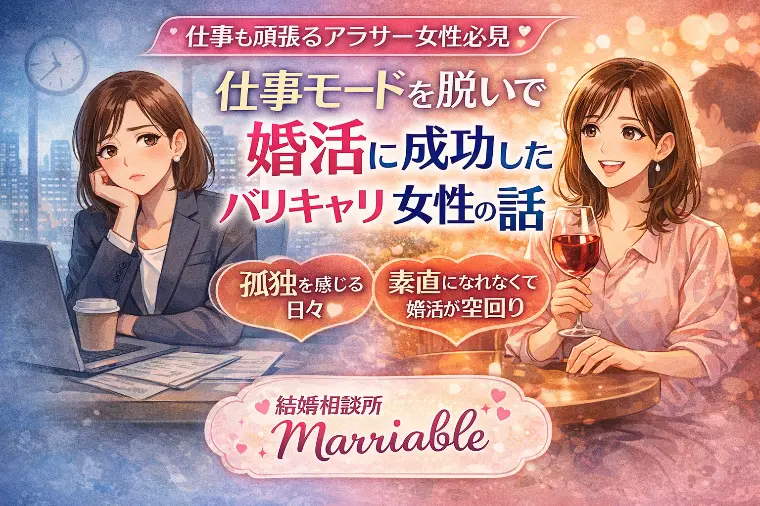 こんにちは。結婚相談所Marriable(マリアブル)です。「仕事は順調。役職もついて、収入も安定している。でも、ふと気付くと周りは結婚・出産ラッシュ。休日に一人で過ごす時間に、猛烈な孤独感に襲われる……」そんな風に、人知れずため息をついていませんか?これまでキャリアを最優先に駆け抜けてきた女性ほど、婚活を始めた途端、「仕事の成功法則が通用しない」という壁にぶつかりがちです。今日は、当相談所で幸せを掴んだ30代半ばのバリキャリ女性、Bさんのエピソードをご紹介します。大手外資系企業でチームリーダーを務めるBさんは、まさに「デキる女」。婚活も仕事と同じ熱量でスタートし、お相手の年収や経歴を細かくチェックし、デート中も「この人は結婚相手として合格か?」とジャッジするような目線になっていました。お相手からは「しっかりされていますね」「一人でも楽しそうですね」と言われるばかり。それは褒め言葉ではなく、男性が入り込む隙がない、という「壁」になっていたのです。「私はこんなに頑張っているのに、どうして大切にされないの?」彼女の心は、次第に疲弊していきました。カウンセリングの中で、Bさんに一つだけ提案をしました。それは、「デートの時だけは、〇〇会社のリーダーという肩書きを捨てて、ただの『一人の女性』として楽しむこと」です。具体的には、以下の3つを意識してもらいました。結婚を「目標達成」と考えず、ただ目の前の人と美味しい食事を楽しむ。「実は最近忙しくて疲れてて…」と、完璧ではない自分を少しだけ見せる。相手を査定するのではなく、「忙しい中、お店を予約してくれてありがとう」と余裕を持って伝える。冷静に考えれば、結婚しているのが「正解」で独身が「不正解」なんてことはありません。でも、Bさんは頑張りすぎて視野が狭くなり、その価値観に固執してしまっていたのです。マインドを切り替えてから間もなく、Bさんはある男性と出会いました。これまでの彼女なら「少し頼りないかも」と切り捨てていたかもしれない、穏やかで優しい男性です。ある日のデート帰り、仕事のトラブルで落ち込んでいたBさんは、思わず彼に「今日は本当に疲れた……」と本音を漏らしました。すると彼は、「いつも頑張ってるもんね。僕の前では無理しなくていいよ」と、彼女を丸ごと包み込んでくれたのです。Bさんはその時、初めて「あ、私は戦わなくていいんだ」と心の底から安心したそうです。キャリアを築いてきたあなたの強さは、素晴らしい才能です。でも、婚活においてはその「強さ」を一旦横に置いて、あなたの内側にある「柔らかい部分」を大切にしてみてほしいのです。「甘え方がわからない」「仕事と婚活の切り替えができない」そんな時は、ぜひMarriableを頼ってください。あなたは、そのままの姿で十分に愛される価値があります。戦士の甲冑を脱いで、あなただけの「最高の居場所」を一緒に見つけにいきましょう。結婚相談所Marriable幸せな結婚をとことん追求することをモットーに、20代30代の会員様をメインに婚活サポートをしています。オンラインでの定期面談やLINEでのお悩み相談など、柔軟なサポートを心がけています。▼お気軽にご相談ください。・ホームページ・Instagram・LINE・Youtubeキャンペーン・相談所乗り換えキャンペーン2026年4月末まで、他の相談所様からの乗り換えの場合は入会金を3万円割引いたします。・春の入会特典2026年2月14日~2026年4月13日までパーソナルカラー診断と骨格診断を無料で受けていただけます。