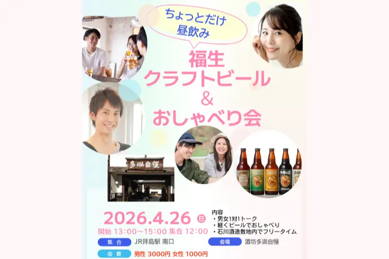 【4/26開催】アプリより、まずは乾杯しませんか?石川酒造で楽しむ、大人の「ちょっとだけ」昼飲み&おしゃべり会「いいね」を送って、メッセージを重ねて、やっと会えたと思ったらイメージと違った……。そんなマッチングアプリ特有の「お疲れモード」から、一度抜け出してみませんか?今回私たちがご用意したのは、「効率」よりも「心地よさ」を大切にした出会いの場。歴史ある「石川酒造」の美しい敷地内で、美味しいクラフトビールを片手に、自然体なあなたで過ごせる3時間です。________________________________________🌸このイベントの「推し」ポイント•お財布に優しい参加費1,000円!カフェに行く感覚で、本格的な蔵元の雰囲気を楽しめます。•「アプリの履歴」より「目の前の会話」プロフィール画面だけではわからない、お相手の「笑うタイミング」や「話し方」が直感でわかります。•15:00解散で、日曜の夜もゆっくり夕方には解散するので、帰りに少しお買い物をしたり、家でゆっくり明日の準備をしたり。週末を無駄にしません。________________________________________📅当日のスケジュール(予定)重苦しい「お見合い」感はゼロ。お散歩気分でご参加ください。•11:30|JR拝島駅西口集合まずはスタッフが笑顔でお迎えします。•11:40|自己紹介シート記入リラックスして書けるよう、アットホームな会場(たまてばこ)をご用意。•12:30|石川酒造へ移動・自己紹介明治から続く歴史的な建築が並ぶ、フォトジェニックな空間で会話も弾みます。•13:00|クラフトビールで乾杯!蔵元自慢のビールを試飲しながらのおしゃべりタイム。お酒の力を少しだけ借りて、緊張をほぐしましょう。•14:00|敷地内見学ちょっとした旅行気分を味わえる見学タイム。自然と会話が生まれる瞬間です。•15:00|解散仲良くなった方と、そのまま二次会へ…なんて流れも大歓迎です!________________________________________📋募集要項•日時:2026年4月26日(日)12:00~15:00•対象:45歳以下の独身男女(特にアプリでの出会いに壁を感じている方)•会費:女性1,000円/男性3,000円•集合:11:30JR拝島駅西口プランナーからのメッセージ「婚活しなきゃ」と気負う必要はありません。「美味しいビールを飲みに行こう」くらいの軽い気持ちでいらしてください。その「余裕」こそが、素敵なご縁を引き寄せる一番の魔法だったりします。春の陽気の中、石川酒造の清々しい空気と一緒に、新しい一歩を踏み出してみませんか?________________________________________お申し込みはこちらから↓ https://ws.formzu.net/dist/S964080329/ 「まずは詳細を詳しく聞いてみたい」という場合も、お気軽にお問い合わせくださいね。