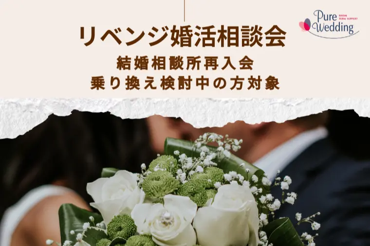 婚活を一度経験したからこそ、「🤔このままでいいのだろうか?」「💡別の相談所なら結果が変わるのでは?」そんな想いを抱えていませんか。ピュアウェディングではこのたび、💍結婚相談所の乗り換え・再入会をご検討中の方向け相談会を開催いたします。😥思うようなご縁に出会えなかった🤷♀️担当カウンセラーとの相性に不安があった🌀活動の進め方が分からず、途中で疲れてしまった📉自分に合う婚活スタイルが分からないまま退会してしまった婚活がうまくいかなかった理由は、あなたの魅力が足りなかったからではありません。実は、✨方法・環境・サポートの選び方✨によって、婚活の結果は大きく変わります。🌱リベンジ婚活だからこそ、最初の「見直し」が重要です今回の相談会では、これまでの婚活状況を丁寧にヒアリングしながら、📝なぜ成果につながらなかったのか🎯今のあなたに合う婚活方法は何か🛤再スタートで大切にすべきポイントは何かを一緒に整理し、無理のない・現実的な成婚プランをご提案いたします。IBJ結婚相談所連盟のネットワークを活かした出会いの仕組みや、🔎乗り換え・再入会時に知っておきたいポイントも、分かりやすくご説明します。🗓開催日:2026年2月21日(土)・22日(日)⏰時間:11:00〜20:00(完全予約制/個別相談・約60分)📍開催方法:東京(渋谷)大阪(梅田)💻オンライン(Zoom)※全国・海外から参加可能💰参加費:無料※🚫無理な勧誘は一切ありません。情報収集・比較検討段階の方も、安心してご参加ください。🔄結婚相談所の乗り換えを検討している🔁一度婚活をやめたが、もう一度挑戦したい💖今度こそ「成婚」を目指したい🗣自分に合う婚活方法をプロに相談したい🌈婚活は「やり直し」ではなく「再設計」婚活経験があるからこそ、次はもっと効率的に・自分らしく進めることができます✨この相談会が、💫あなたにとって前向きな再スタートのきっかけ💫となれば幸いです。👉相談会の詳細・ご予約はこちら https://purewedding.net/news/blog -3/50代60代のベテランコーディネーターがサポートします。■パワーカップル婚(共働き・共家事・共育児)希望の方■金融、商社、外資、IT、コンサル、経営者などのお仕事の方■国公立、MARCHご卒業の方■海外駐在員男女、外国人との結婚希望の方、海外生活可能な男女、★トライアル入会制度あり、コーディネーターとの相性、サポート力をご確認ください。★全国海外対応、オールオンライン対応で、来店なしでスタート可能★ご両親からの婚活相談対応可能です。★365日朝7時から22時までLINE対応、30分クイックレスポンスの寄り添いサポートが人気です。※初回面談はオンラインを推奨しております。30分簡単相談、60分のしっかり相談、21時スタートまで対応、お仕事の合間、お仕事後の時間も対応可能です。※関西の転居転勤後は大阪店、海外への転居後はグループ店舗「海外婚活PureGlobalMatching」でのサポートが可能です。