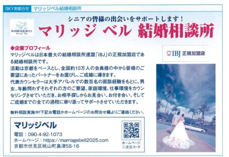 最近、シニアの方からのご相談が非常に多く寄せられています。一つは人生百年時代といわれるこの時代、シニアの方々が再度パートナーを求められるケース、もう一つはシニアの方々のお子様、お孫様の婚活を応援したいという想いで当相談所を尋ねられるケースです。そのため、マリッジベルがかねてからご縁のあるシニアのためのコミュニティである公益財団法人京都スカイセンターにお声掛けしたところ、是非一緒にシニア婚活を推進したいとのお声をいただき、まずはスカイニュースというスカイセンターの定期冊子に掲載いただきました。スカイセンターは個人会員数は5000人以上、法人会員は関西に本社を置く大手企業中心に約80社が参加しているシニアのためのコミュニティです。今後はスカイセンターとともに、シニアの婚活を推進していきます!