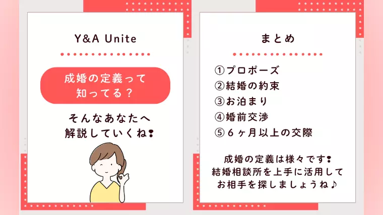 成婚とは・・・会員様同士がお互いに結婚することを決めることIBJルールのもと、Y&AUniteが定める成婚の定義は以下の5つに分けられます。1️⃣プロポーズ2️⃣結婚の約束3️⃣お泊まり4️⃣婚前交渉5️⃣6ヶ月以上の交際1️⃣プロポーズ交際期間中にプロポーズをしてお相手がそれを受けた場合、もちろん成婚となります。2️⃣結婚の約束交際期間中に結婚の意思が固まり、お互いが結婚の約束をした場合は成婚とみなします。3️⃣お泊まり交際期間中に同居や同棲、旅行や宿泊をした場合も成婚とみなします。4️⃣婚前交渉交際期間中に身体の関係を持った場合は成婚とみなします。(但し、キスやハグは除く)5️⃣6ヶ月以上の交際交際期間が6ヶ月以上を経過した場合は成婚とみなします。(但し、強制ではなく相談)成婚の定義とは、加盟団体・結婚相談所によって様々なのが現状です。婚活中でこれから結婚相談所へ入会しようと考えている方、是非一度、成婚の定義についても再確認してみるとゴールもイメージできてさらに良いかと思います✅とはいえ、ルールがしっかりと決められているということは、言い返せば安全がしっかりと守られているということです。通常のマッチングアプリ等では安全上のルールや制限についてのセキュリティがまだまだ心配される中、結婚相談所の良い点でもあるので、こちらを上手に活用すればきっと健全で良縁な出会いも訪れます👐🏻婚活をする上で、まずは結婚相談所があなたにとってベストな条件なのか?そうであるなら、どこの結婚相談所があなたに一番合っているのか?そこから考えていくと見えてくるかもしれないですね🧐Y&AUniteがあなたにとって最適か、無料相談も行っているので是非一度ご相談ください。お待ちしております💁🏻♀️