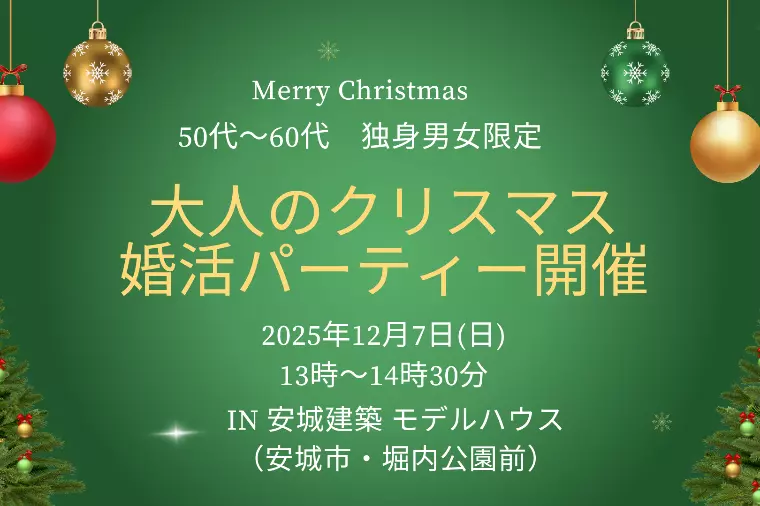 こんにちは🐱💖西尾市・西三河エリアの結婚相談所「恋するレイラ」婚活カウンセラーの吉川英子です。年の瀬が近づき、街がイルミネーションに包まれる季節。大人世代の皆さまにぴったりの「少人数制クリスマス婚活パーティー」を開催いたします✨会場は、安城市・堀内公園前にある高品質なモデルハウス。木の温もりと洗練されたインテリアに包まれた空間で、お茶とお菓子を囲みながら、穏やかで落ち着いた時間をお過ごしいただけます。「仕事でも責任ある立場を経験してきたからこそ、今は心安らぐ関係を築きたい」そんな思いを持つ50〜60代の方が多く参加されています。過去のパーティーでは、「趣味のゴルフや旅行の話で盛り上がった」「お互いに仕事への理解があって安心できた」など、自然な会話の中からご縁が生まれています。今回の対象は、50歳〜69歳の独身男女。仕事を頑張ってこられた方、社会的にも安定した方など、落ち着いた大人同士の出会いを求める方が多くいらっしゃいます。「同年代で価値観の合う方に出会いたい」「経済的にも精神的にも自立した関係を築きたい」そんな方にぴったりの婚活イベントです。📅日時:2025年12月7日(日)13:00〜14:30📍場所:安城建築モデルハウス(安城市・堀内公園前)🎯対象:50歳〜69歳の独身男女💰参加費:男性5,000円/女性1,000円👥定員:男女各6名(※男女比が同数にならない場合もございます)🧾持ち物:身分証明書(免許証またはマイナンバーカード等)パーティー終了後には、マッチング結果を個別にご連絡いたします。その後のご縁をしっかりサポートいたしますので、婚活が初めての方も安心です。~「ご縁を信じる気持ち」を応援します~今回は、女性限定でうれしい特典をご用意しました。希望者には無料タロット占い(1名10分) 出会い運や恋愛の流れなどを、気軽にご相談いただけます。 占いを取り入れた理由は、「ご縁を信じるきっかけを持ってほしい」から。 未来に前向きになれる時間をお届けします。抽選で1名様に『ララアップ』(8,000円相当)プレゼント🎁 ララアップは、耳に装着することで耳周りの筋肉をゆるめ、 姿勢や血行を整える新感覚アクセサリー。 おしゃれを楽しみながら、フェイスラインや姿勢ケアも叶う人気のセルフケアアイテムです。💬キャッチフレーズ:カラダが整う新感覚アクセサリー「ララアップ」可愛いだけじゃなく、健康も美しさも手に入れませんか?「どんな話をすればいいか分からない」という方もご安心ください。カウンセラーが事前にご案内し、プロフィールカードを活用してお話が弾むようサポートします。たとえば…「好きな旅行先」や「健康のためにしていること」など、共通の話題から笑顔が生まれ、自然と会話が広がっていきます。これまでの参加者からも、「ゆっくり話せて相手の人柄が伝わった」「静かな雰囲気が居心地よかった」と好評をいただいています。同年代で価値観の合うパートナーと出会いたい経済的にも精神的にも自立した関係を築きたい旅行や趣味を一緒に楽しめる相手を見つけたい落ち着いた雰囲気の中で自然な会話をしたい再婚や、第二の人生を共に歩むパートナーを探している参加をご希望の方は、「恋するレイラ」公式LINEにて【婚活パーティー参加】とメッセージをお送りください。詳細を折り返しご案内いたします。公式LINEは下記プロフィールリンクまたはQRコードからどうぞ👉 https://lin.ee/nTTouJZ 「恋するレイラ」では、婚活パーティーでの服装・会話のコツ・プロフィールカードの書き方など、初めての方でも自信を持って参加できるよう、丁寧にサポートしています🌸服装アドバイス男性には「清潔感を感じるカジュアルジャケット」、女性には「柔らかい印象のワンピースやニットスタイル」など、年代に合ったスタイルを具体的にご提案。会話のポイント「何を話せばいいかわからない…」という方には、“最初の一言”から自然に話が広がるトピック例もお伝えしています。婚活後のフォロー「パーティー後も活動を続けてみたい」という方には、結婚相談所としての個別サポートプランもご案内しています💍「どんなサービスなんだろう?」「自分に合っているのかな?」そんな疑問は、実際に話を聞いてみるのが一番です☺️気軽にお問い合わせいただける特設ページをご用意しました!📲スキマ時間に、ちょっとのぞいてみませんか?👉https://koisuru-leila-lp.com/Page?id=P8c577d3「恋するレイラ」では、初回カウンセリングを無料で実施しています。占いカウンセリングを通してあなたの内面を整理し、“本当に幸せになれる関係”を一緒に探していきます。小規模相談所ならではの手厚いサポートで、焦らず、自分らしく婚活を進めたい方に寄り添います。実際にどんな方が登録されているかをご覧いただけるほか、ちょっぴり占い体験もご用意🔮※四柱推命鑑定書(PDF3枚)プレゼント🎁結婚相談所が初めての方でも安心してお試しいただけます。カウンセリングは【