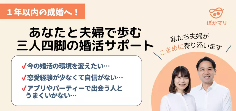 本当にありがとうございました。 ぽかマリさんのおかげで素敵な男性と巡り逢うことができました。 婚活が不慣れな私(40歳)が5ヶ月で成婚退会出来たのは本当に素敵なぽかマリさんご夫婦のおかげです。 お勧めポイント ・ご夫婦のお人柄 ・マメかつ丁寧なサポート ・嘘偽りない率直なアドバイスやコメント ・相場よりも安いと思います 本当におすすめの相談所さんです! 大手にはないきめ細かいサポートと丁寧な対応、密な連絡、何をとっても素敵なお2人です! ぜひ婚活をされるならぽかマリさんに相談されてみて下さい!